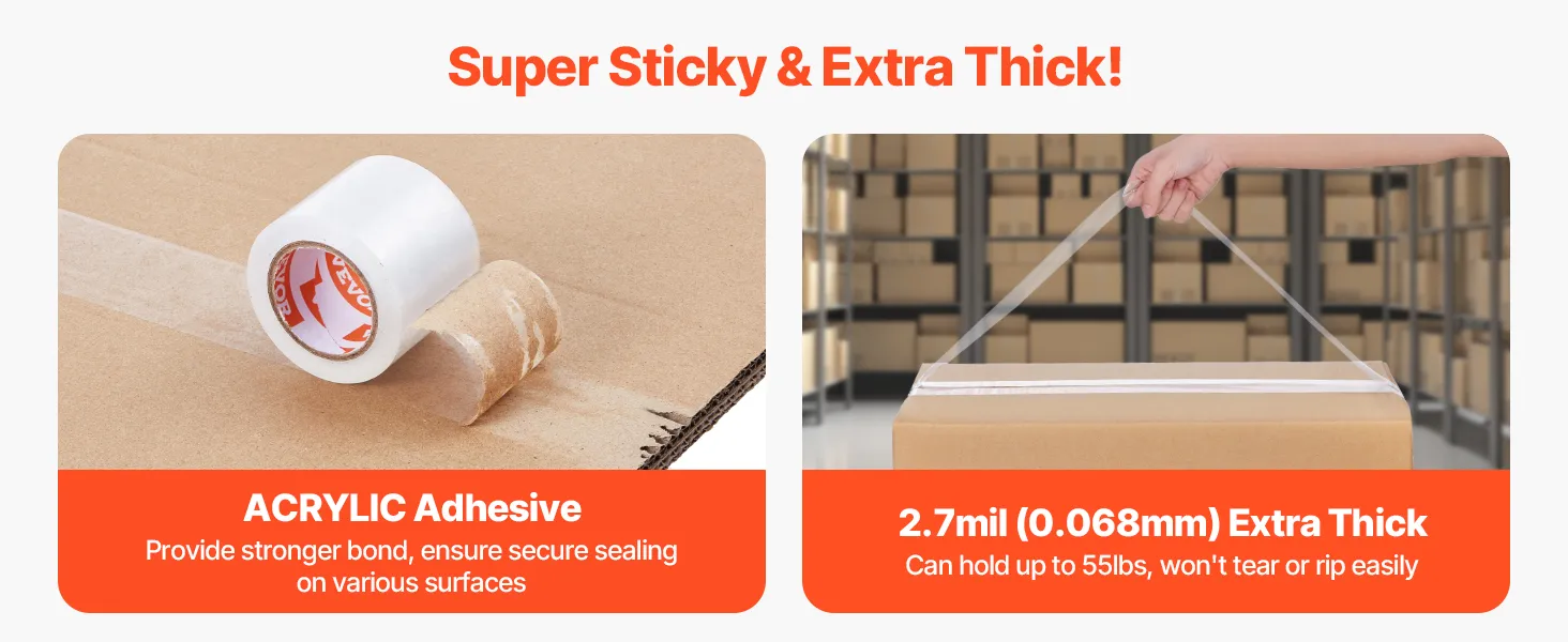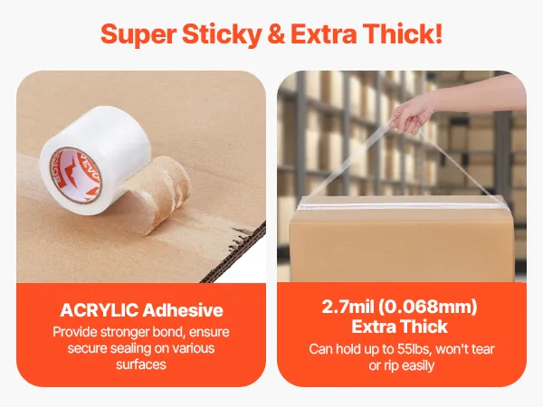Onze 2,7 mil (0,068 mm) dikke pakkettape is gemaakt van een hoogwaardige acryllijm voor een uitstekende, langdurige hechting. Het zorgt ervoor dat uw pakketten veilig verzegeld blijven, zelfs bij ruwe behandeling en transportomstandigheden.