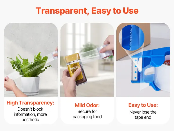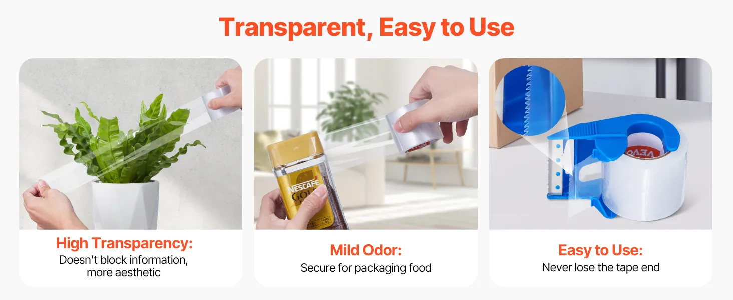 Eenvoudig in gebruik: Wordt geleverd met 6 dispensers. Onze duurzame, transparante verpakkingstape is geschikt voor standaard dispensers en kan met de hand worden afgescheurd, waardoor u snel en efficiënt kunt inpakken. Hoge transparantie zorgt voor duidelijke etikettering zonder dat belangrijke informatie wordt verhuld.