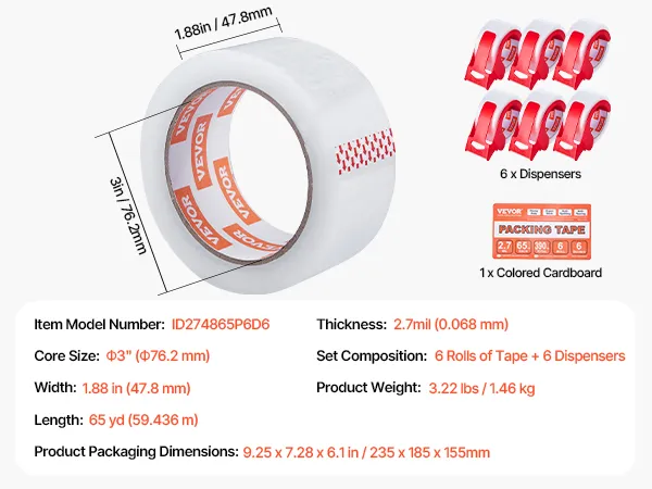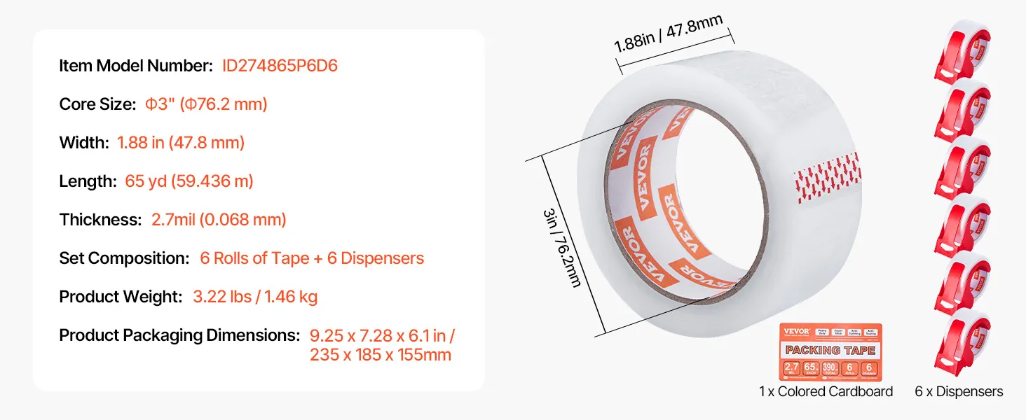 VEVOR Transparante verpakkingstape, kern van 76,2 mm, verpakking van 6 stuks 47,8 mm x 59,436 m Pakkettape met dispenser, 0,068 mm Zware tape Ideaal voor verhuizingen, opslag en verpakking, verzending en post