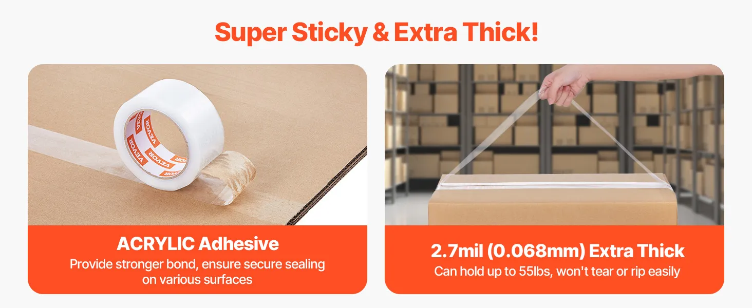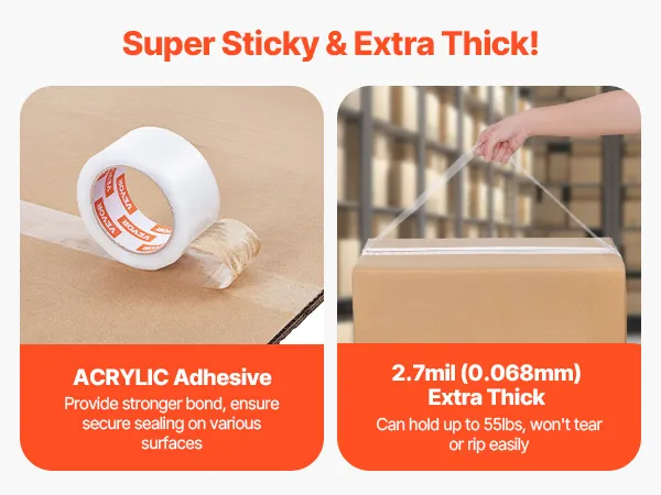 Onze 2,7 mil (0,068 mm) dikke pakkettape is gemaakt van een hoogwaardige acryllijm voor een uitstekende, langdurige hechting. Het zorgt ervoor dat uw pakketten veilig verzegeld blijven, zelfs bij ruwe behandeling en transportomstandigheden.