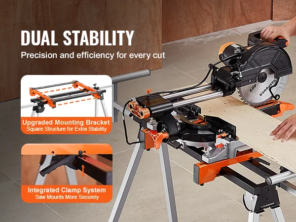The upgraded square mounting bracket and one-piece clamp provide dual stability, keeping your saw precisely positioned during fine cuts. This stand for miter saw ensures perfect results, while extending the lifespan of your tools.