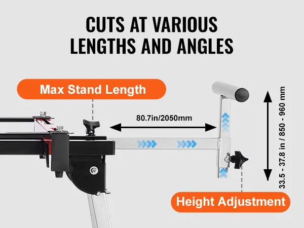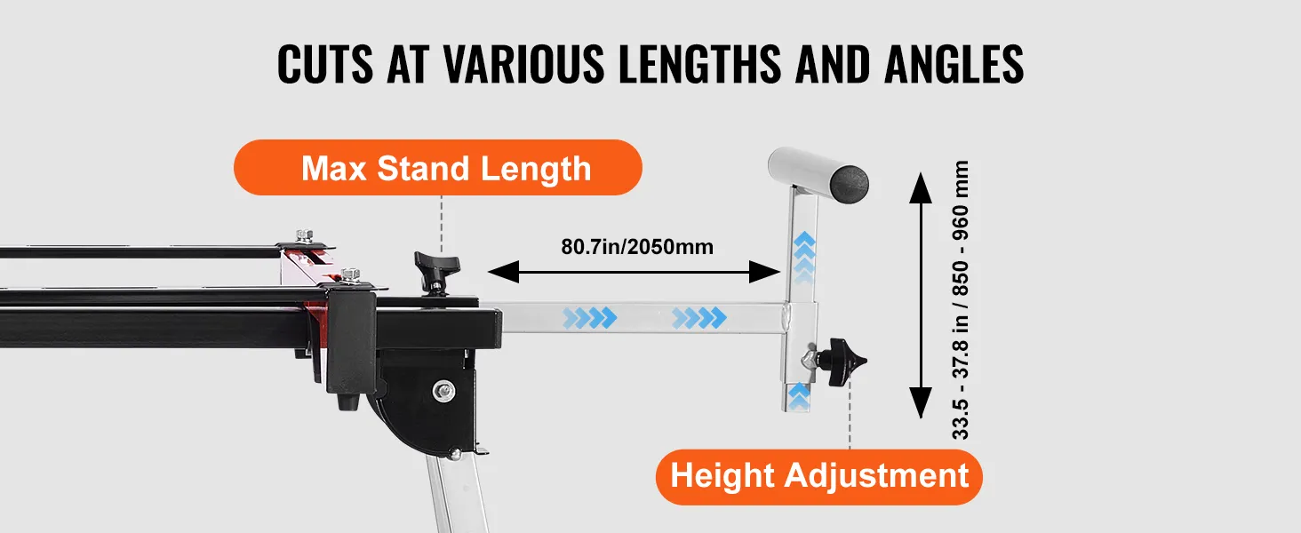 You can adjust the length of the support arms to fit the size of your material, ensuring stability even for large items. The height is also customizable, allowing angled cuts by setting different heights on each side for greater precision.