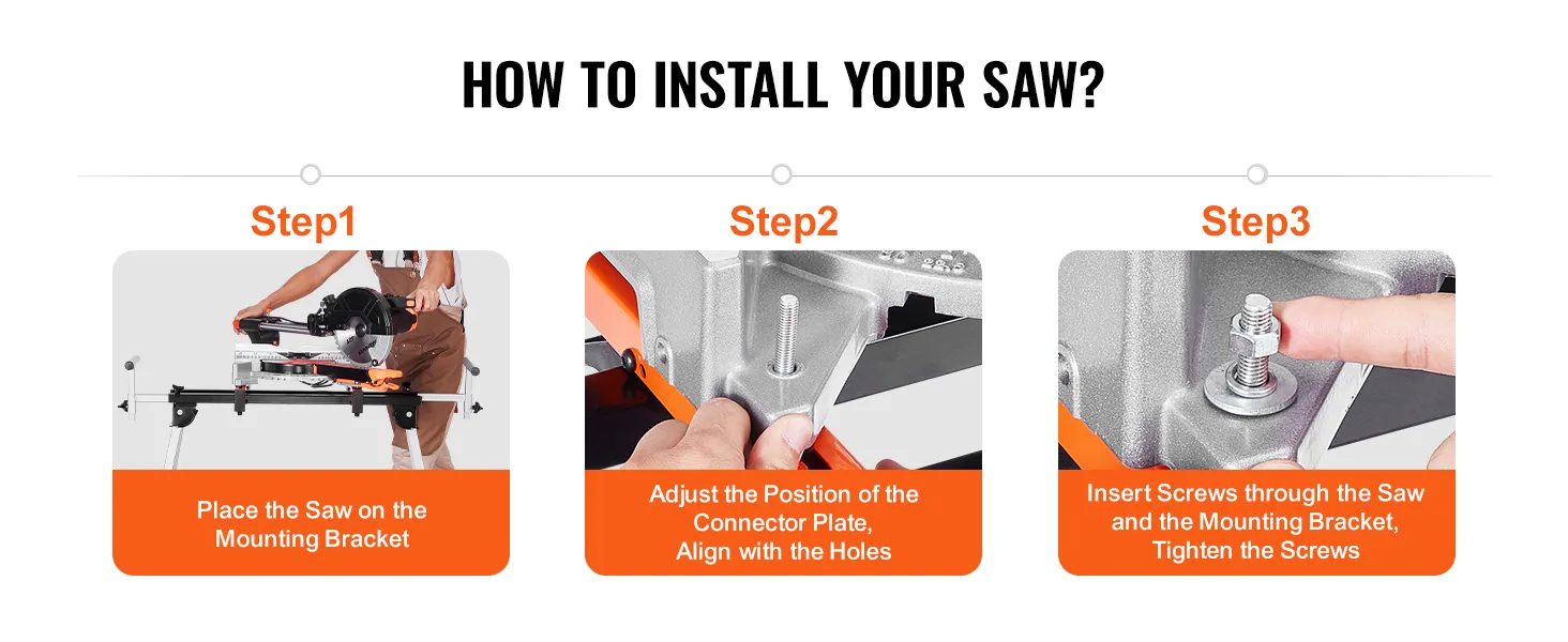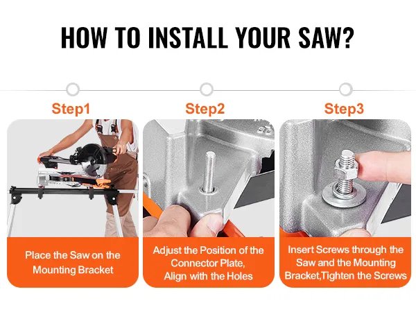 Place the saw on the mounting bracket, align the mounting plate, and tighten the screws to complete the installation quickly. This secure setup of our folding miter saw stand saves time and ensures stable operation, so you can start working faster.