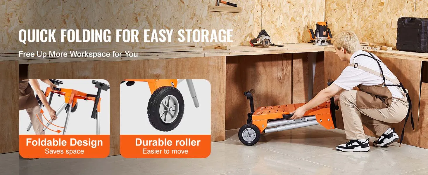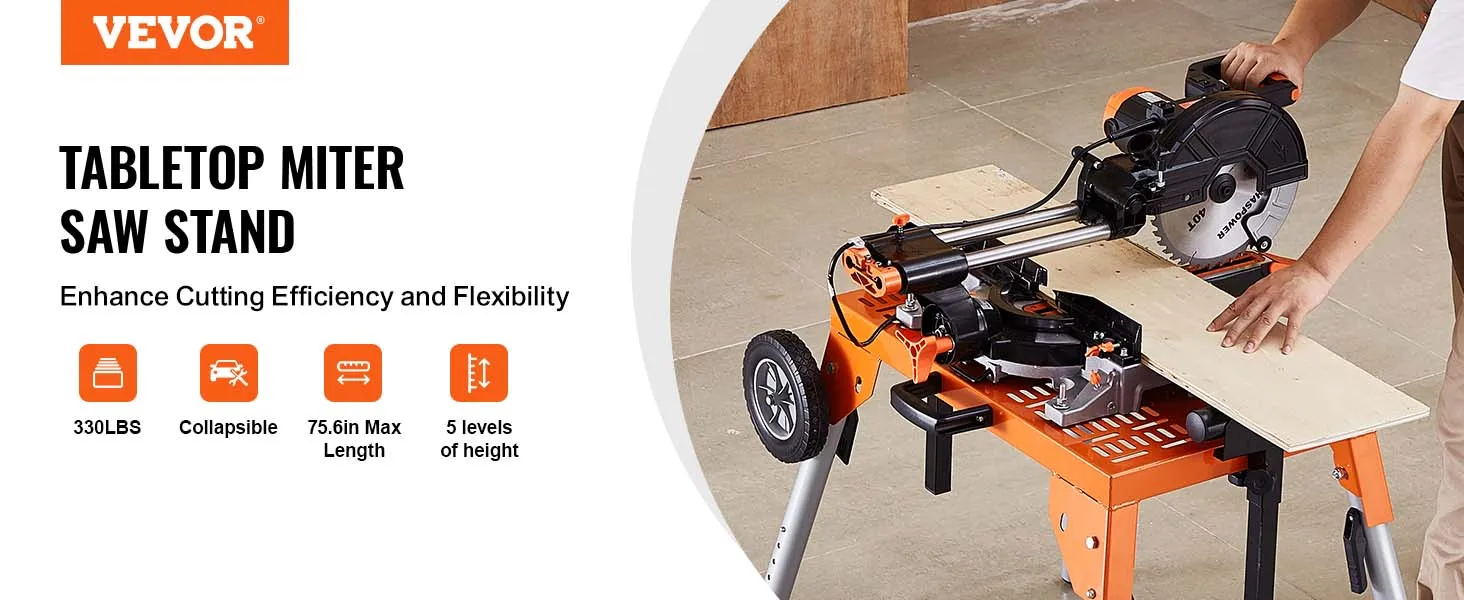 VEVOR Verstekzaagstandaard met tafelblad en wielen, 150 kg draagvermogen, opvouwbaar stalen rolstatief voor verstekzagen, verstelbare hoogte en lengte, draagbaar verstekzaagstatief
