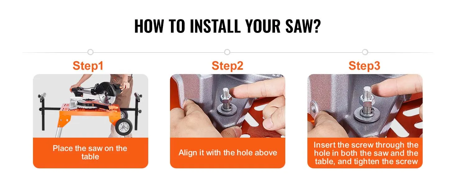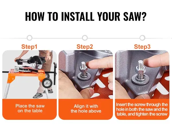 Eenvoudige installatie: Het installeren van de zaag is eenvoudig en omvat drie stappen: positioneren, uitlijnen en vastdraaien. Deze snelle en veilige opstelling van de inklapbare verstekzaagstandaard bespaart tijd, waardoor u sneller kunt beginnen met werken en tegelijkertijd stabiele prestaties tijdens het gebruik kunt garanderen.