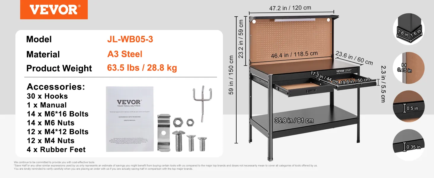 LED-verlichting voor beter zicht: Onze werkbank is voorzien van een 14W LED-lamp en zorgt voor energiezuinige verlichting. Het is vooral handig in slecht verlichte kelders of garages, omdat het zorgt voor optimaal zicht en u in staat stelt nauwkeurig te werken.
