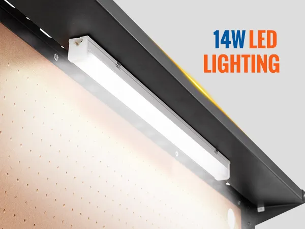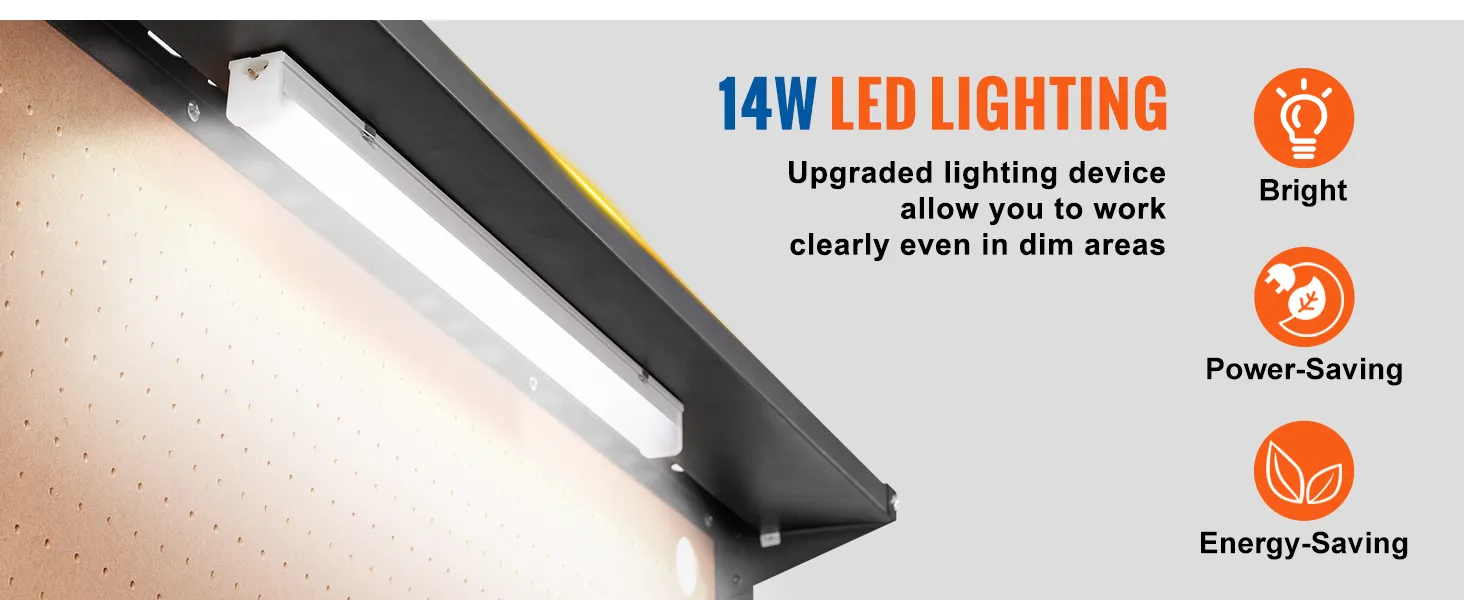 Met een 14W LED-verlichtingssysteem, geïntegreerd stroompaneel en handige opbergladen is deze ophangbordwerkbank de perfecte metgezel voor uw werkruimte.
