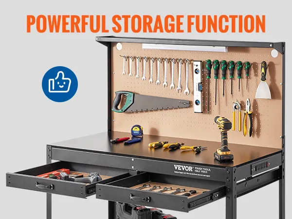 De ophangbordwerkbank heeft ingebouwde stopcontacten met 4 stopcontacten en 2 USB-poorten, waardoor je meerdere gereedschappen tegelijkertijd kunt gebruiken.
