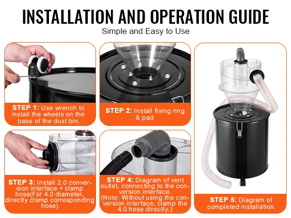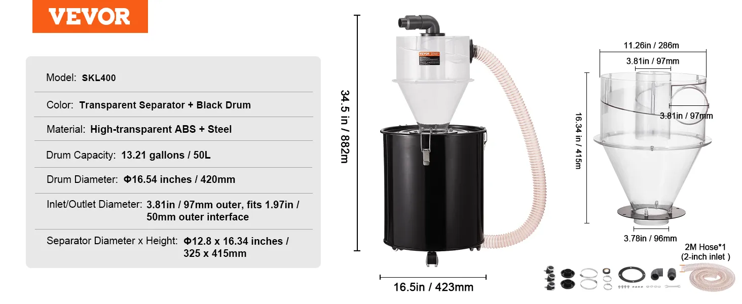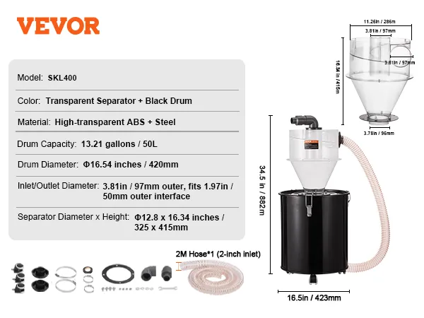 Met een unieke cycloonscheidingstechnologie wordt de frequentie van filterwisselingen verminderd. Dankzij het transparante ABS-ontwerp kunt u de scheidingsstatus op elk moment controleren. Compatibel met standaard slangen van 4,0 inch (101,6 mm).