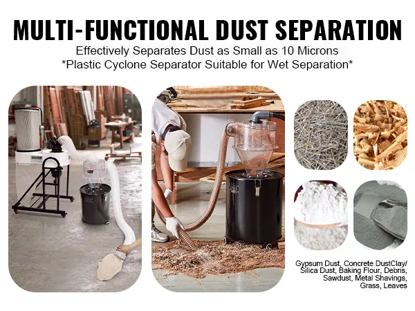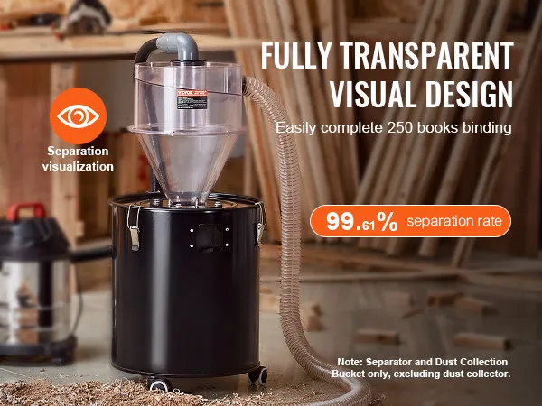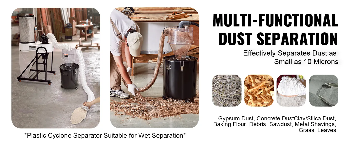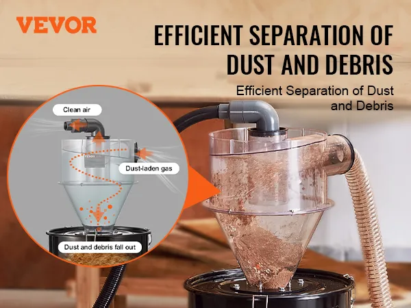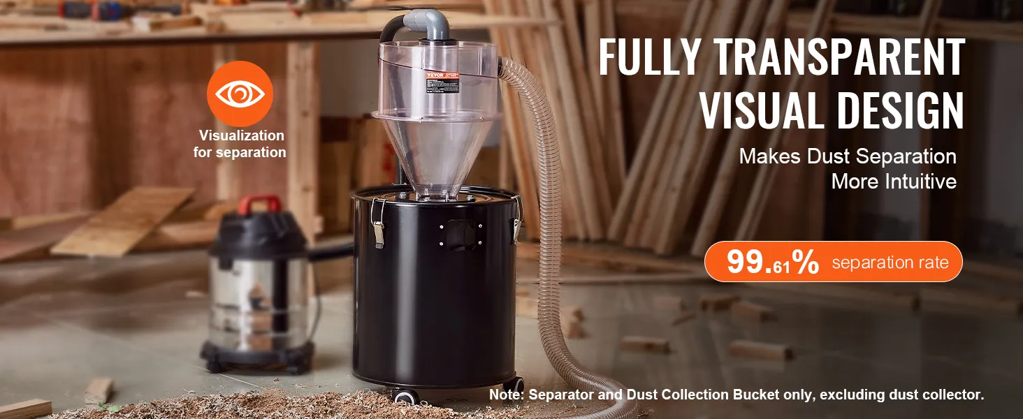 Dankzij zijn uitzonderlijke afscheidingsprestaties is deze afscheider ideaal voor diverse reinigingswerkzaamheden, of het nu in werkplaatsen, op bouwplaatsen of in houtverwerkingsruimtes is.