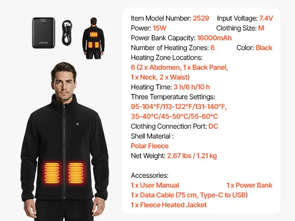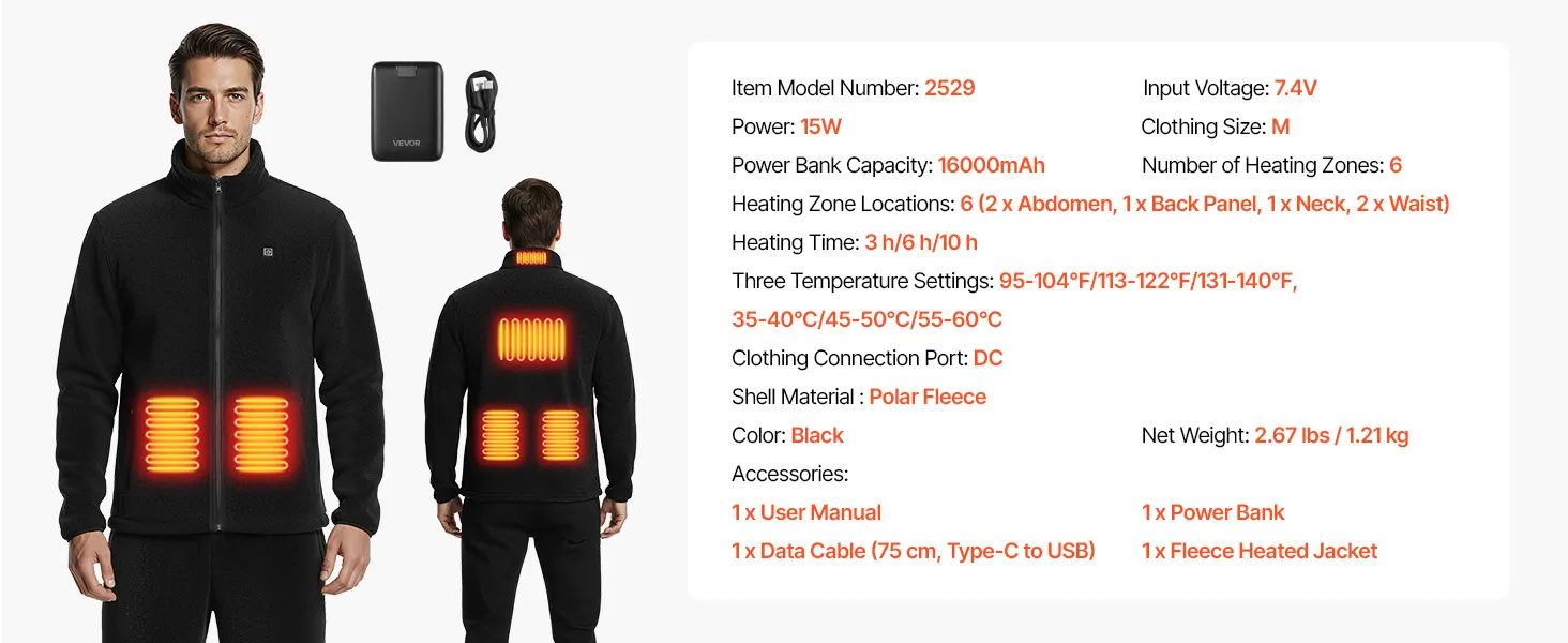 VEVOR Verwarmde Fleece Jas voor Heren, Verwarmde Jas met 7,4V 16000mAh Oplaadbare Powerbank, 6 Verwarmingszones, 3 Temperatuurinstellingen, 3/6/10 Uur Warmte, voor Winterse Outdoor Camping, Zwart, M