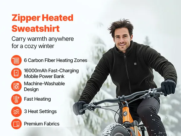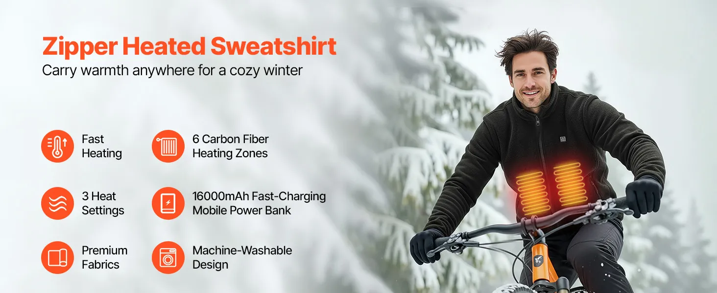 Deze verwarmde sweater is voorzien van een verwarmingssysteem met 6 zones van koolstofvezel voor snelle en gelijkmatige warmte. Hij heeft drie instelbare temperatuurstanden en wordt geleverd met een snellaadbare powerbank van 16000 mAh. Gemaakt van hoogwaardige stof, is hij duurzaam en machinewasbaar voor gebruik in de winter.