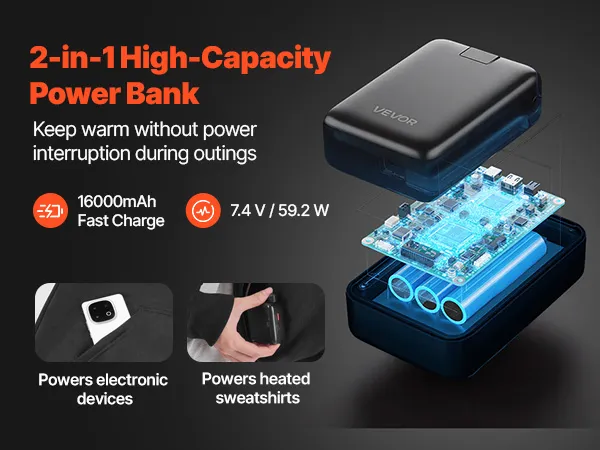 Onze verwarmde jas is voorzien van een 16000 mAh powerbank met snellaadfunctie voor een langere batterijduur. Met een vermogen van 7,4 V/15 W houdt deze niet alleen de verwarmde trui warm, maar laadt hij ook je elektronische apparaten op tijdens het fietsen.