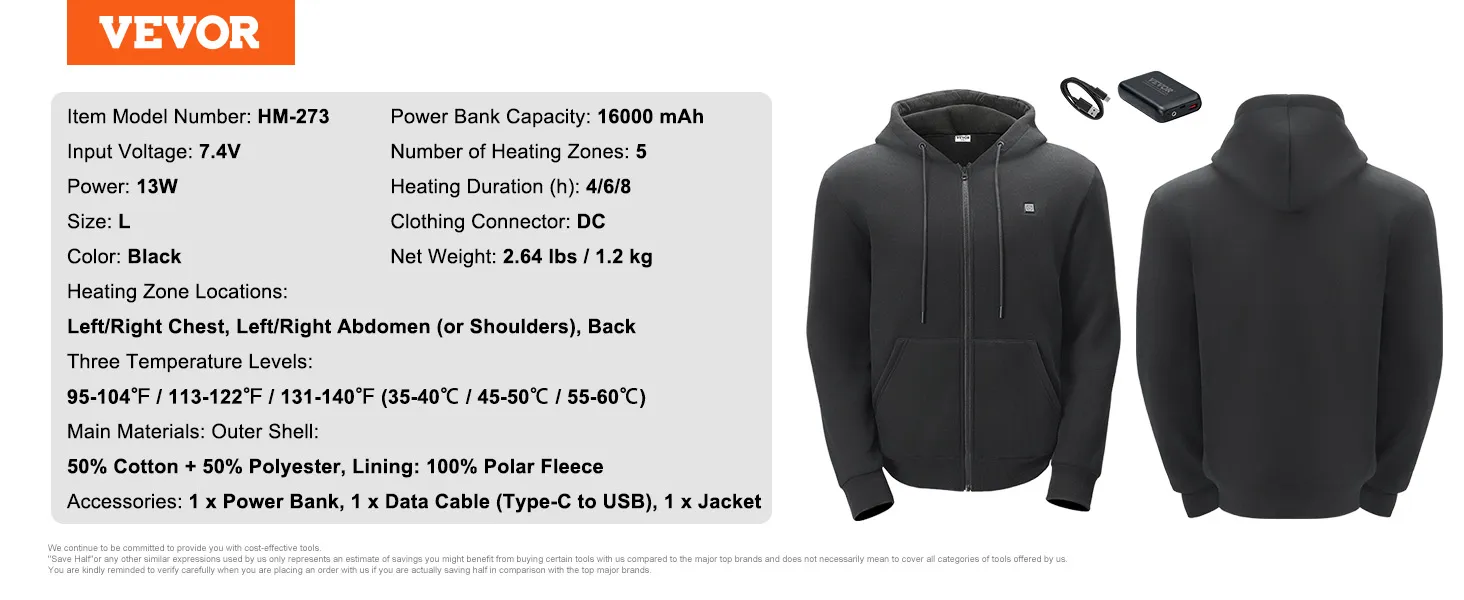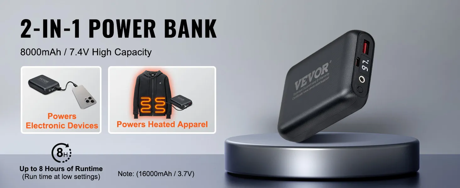 Long-Lasting Warmth: Equipped with a high-performance battery with a capacity of up to 8000mAh / 7.4V (16000mAh / 3.7V), it ensures that the sweatshirt can continue to work for 3-4 hours in high-intensity heating mode, 5-6 hours in medium-intensity mode, and extends to 7-8 hours in the lowest heating mode, providing users with long-time warmth protection. The battery in this sweatshirt can not only power the garment itself, but also provide emergency charging for small electronic devices