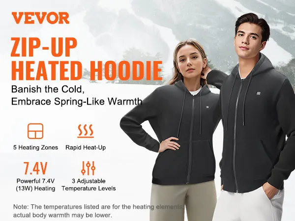 VEVOR Heated Hoodie, Unisex Heated Sweatshirt with Battery Pack 7.4V, Zip Up Electric Jacket with 5 Heating Zones for Men & Women, Lightweight Warm Heated Outdoor Pullover for Camping, L Size Black