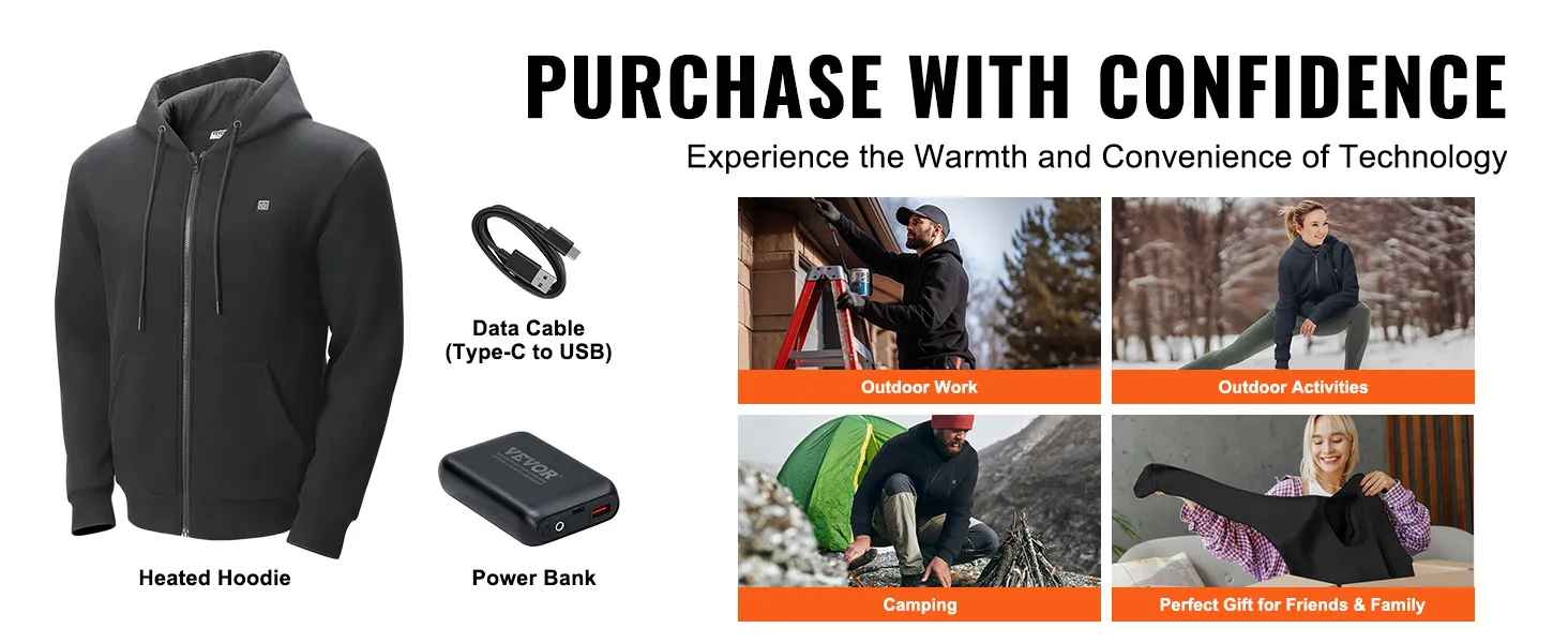 Upgrade Heating Performance: This hoodie adopts high efficiency carbon fiber heating technology, high power heating system, electric heated hoodie takes a leap in preheat duration thanks to the great thermal conductivity. It will heat before you can notice it. Note: The above temperature is the temperature of the heating wire, the actual temperature of the human body will be lower than the heating temperature indicated in some heating jackets. Warm Tips: We recommend choosing a size larger than you usually wear!