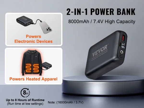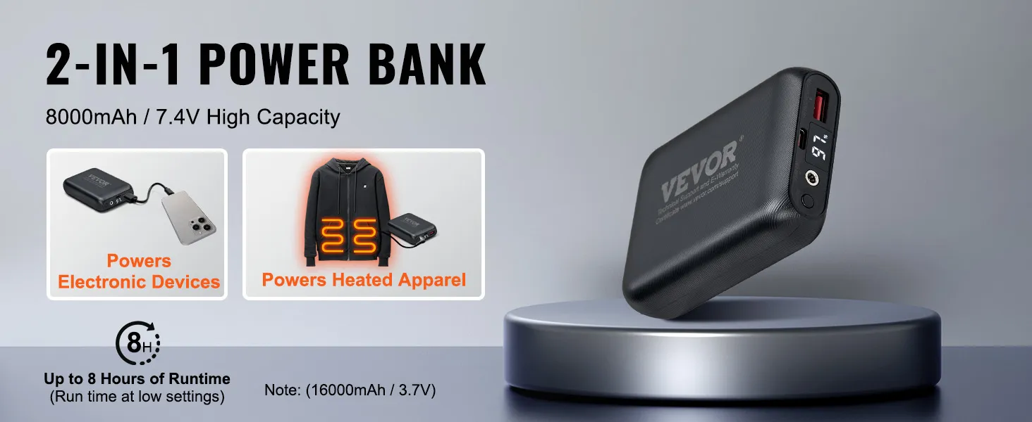 Long-Lasting Warmth: Equipped with a high-performance battery with a capacity of up to 8000mAh / 7.4V (16000mAh / 3.7V), it ensures that the sweatshirt can continue to work for 3-4 hours in high-intensity heating mode, 5-6 hours in medium-intensity mode, and extends to 7-8 hours in the lowest heating mode, providing users with long-time warmth protection. The battery in this sweatshirt can not only power the garment itself, but also provide emergency charging for small electronic devices