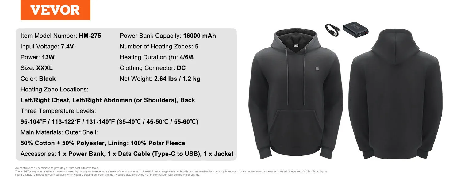 Verbeterde verwarmingsprestaties: deze verwarmde pullover-hoodie maakt gebruik van uiterst efficiënte verwarmingstechnologie van koolstofvezel en een krachtig verwarmingssysteem. Dankzij de hoge thermische geleidbaarheid duurt het voorverwarmen veel langer bij elektrisch verwarmde hoodies. Voor je het weet is het warm. Let op: De bovenstaande temperatuur is de temperatuur van de verwarmingsdraad. De werkelijke temperatuur van het menselijk lichaam is lager dan de verwarmingstemperatuur die door sommige verwarmingsmantels wordt gespecificeerd.