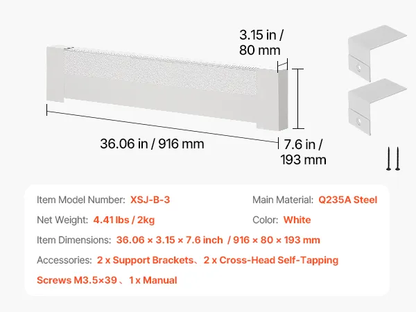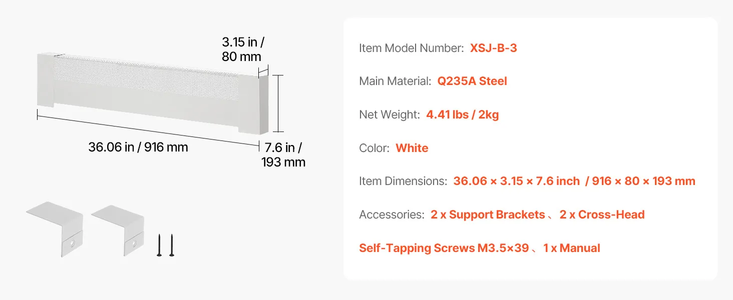 VEVOR Radiatorbekleding, Basic Serie, 916 x 80 x 193 mm, Standaard Frontbekleding voor Elektrische Radiatoren, Vervangende Bekleding van Robuust Staal, voor Slaapkamer, Wit