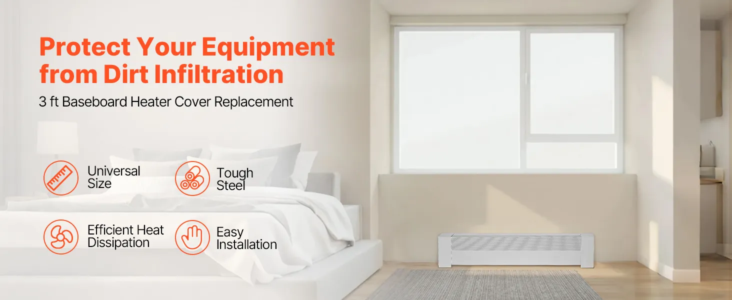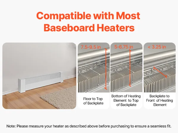 Standaardmaat: Deze verwarmingsafdekking van 3 voet/914,4 mm past op verwarmingstoestellen met een afstand van de vloer tot de bovenkant van de achterplaat: 7,5-9,5 inch (19,05-24,13 cm), van de onderkant van het element tot de bovenkant van de achterplaat: 5-6,75 inch (12,7-17,15 cm) en een afstand tussen de achterplaat en de voorkant van het element van minder dan 3,25 inch (8,26 cm).