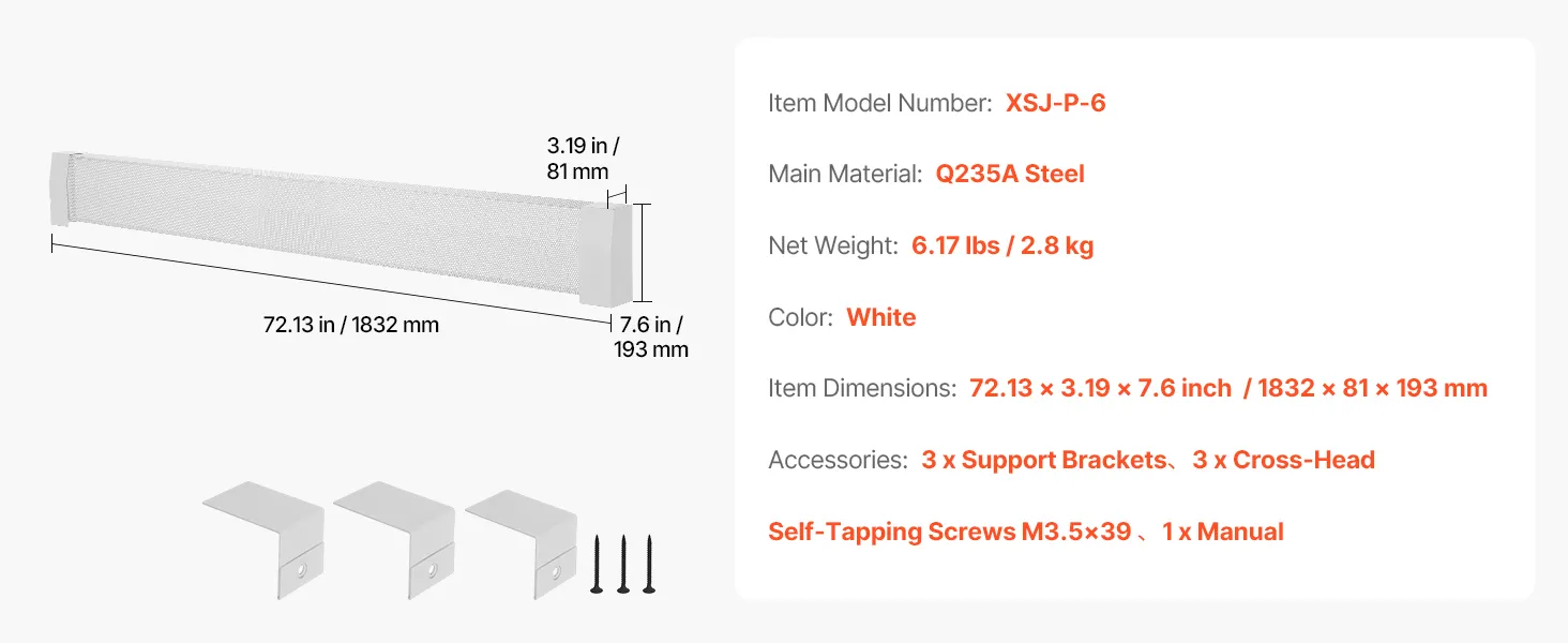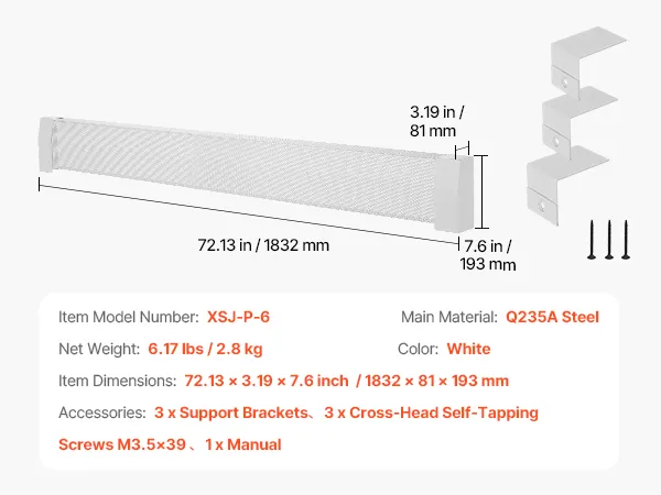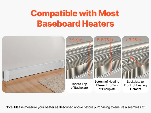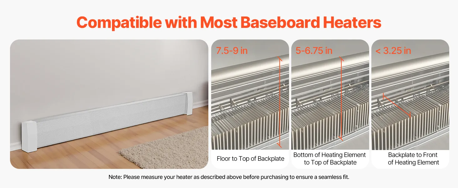 Standaardmaat: Deze verwarmingsafdekking van 1832 mm past op verwarmingstoestellen met een afstand van de vloer tot de bovenkant van de achterplaat: 7,5-9 inch (19,05-22,86 cm), van de onderkant van het element tot de bovenkant van de achterplaat: 5-6,75 inch (12,7-17,15 cm) en een afstand tussen de achterplaat en de voorkant van het element van minder dan 3,25 inch (8,26 cm).
