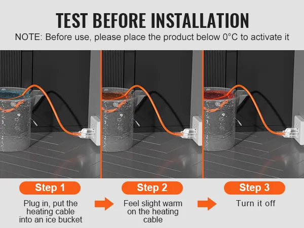 Handige installatie: de voorgemonteerde verwarmingskabel is ontworpen voor eenvoudige installatie. Leg hem gewoon in een rechte lijn neer en kruis of overlap de kabel niet. Zorg ervoor dat de thermostaat en de gehele verwarmingskabel volledig contact maken met de leiding voor optimale prestaties. Test de kabel vóór installatie.
