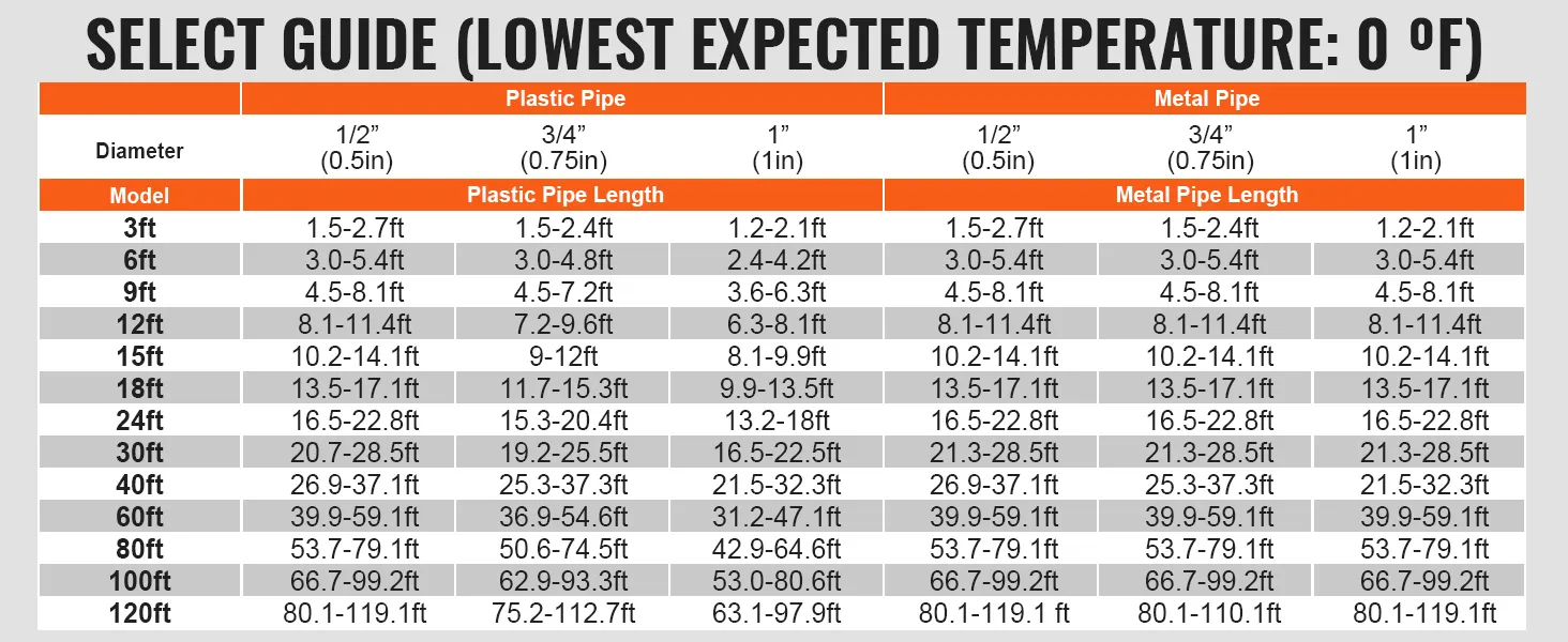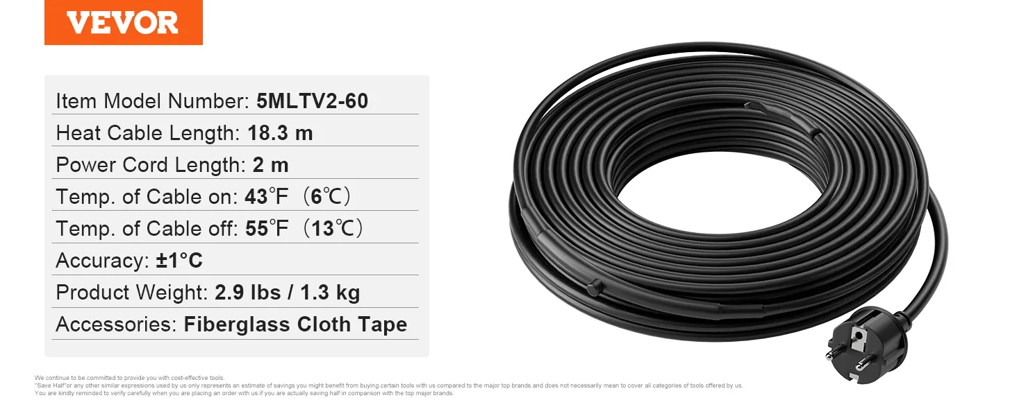 No More Frozen Pipes: Protect your water pipes from freezing with our 18.3m 16.4W/m self-regulating heating cable. It automatically adjusts the power output according to the ambient temperature, raising the temperature by 85℉ in just 5 minutes, providing rapid and reliable protection against cold.