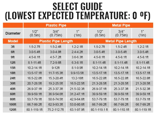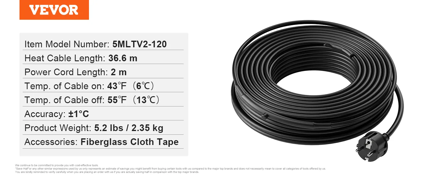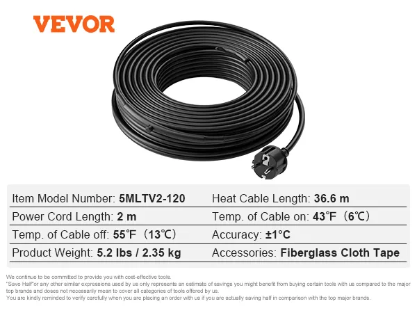 No More Frozen Pipes: Protect your water pipes from freezing with our 36.6m 16.4W/m self-regulating heating cable. It automatically adjusts the power output according to the ambient temperature, raising the temperature by 85℉ in just 5 minutes, providing rapid and reliable protection against cold.