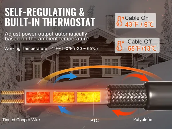 This pipe heating cable features advanced self-regulating technology, automatically adjusting heating power based on the ambient temperature. Built with a thermostat, it automatically turns on at 43℉ / 6℃ and stops working at 55℉ / 13℃, eliminating the need for constant monitoring.