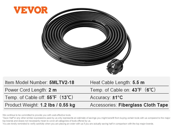 No More Frozen Pipes: Protect your water pipes from freezing with our 5.5m 16.4W/m self-regulating heating cable. It automatically adjusts the power output according to the ambient temperature, raising the temperature by 85℉ in just 5 minutes, providing rapid and reliable protection against cold.