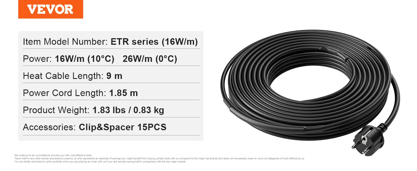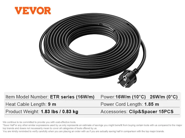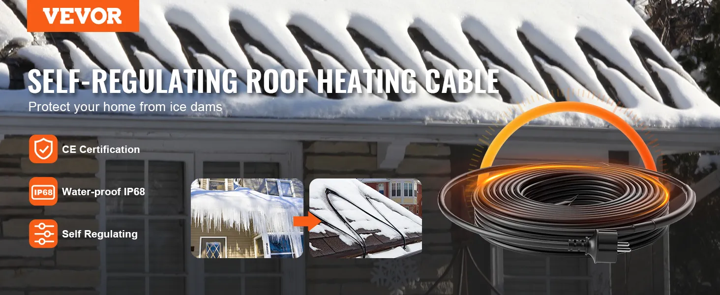De 9 meter lange dakverwarmingskabel van 16 W/m van VEVOR met zelfregulerende technologie kan de temperatuur automatisch aanpassen aan de omgeving.