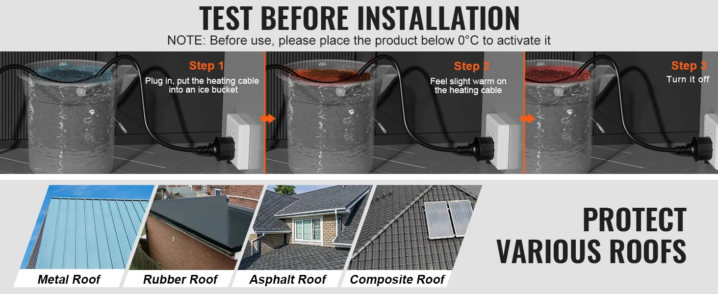 Handige en probleemloze installatie: de voorgemonteerde dakverwarmingstape is eenvoudig te installeren, inclusief spiraalwikkeling, met opties voor spiraalwikkeling, kruiswikkeling of rechte plaatsing. Het is compatibel met een verscheidenheid aan dakbedekkingsmaterialen, waaronder metaal, rubber, hout, asfalt, klei, plastic en composieten.