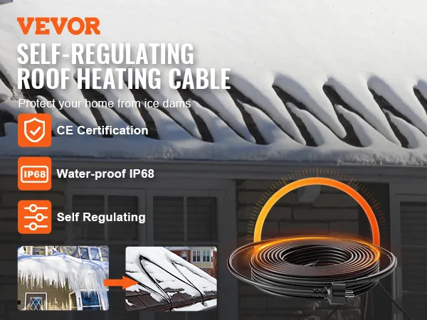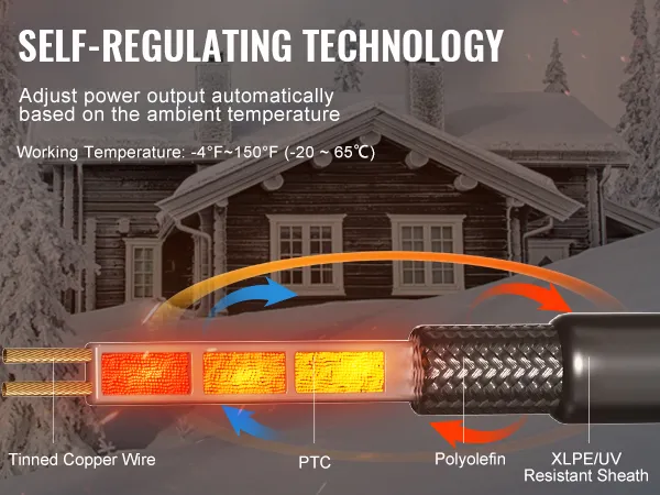 Zelfregulerende technologie: deze zelfregulerende dak- en dakgootverwarmingskabel van 9 meter past de warmteafgifte automatisch aan de omgevingstemperatuur aan, waardoor de energiekosten effectief worden verlaagd. U hoeft zich geen zorgen te maken over oververhitting of bevriezing! Maximale zelfregelende temperatuur: 150°F/65°C.