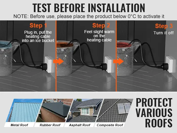 Test vóór installatie: Rol de kabel uit, steek hem in het stopcontact en plaats de buisverwarmingstape een paar minuten in een ijsemmer. Normaal gesproken voelt u na een paar minuten een lichte warmte op de verwarmingskabel. Dan kun je het uitschakelen.