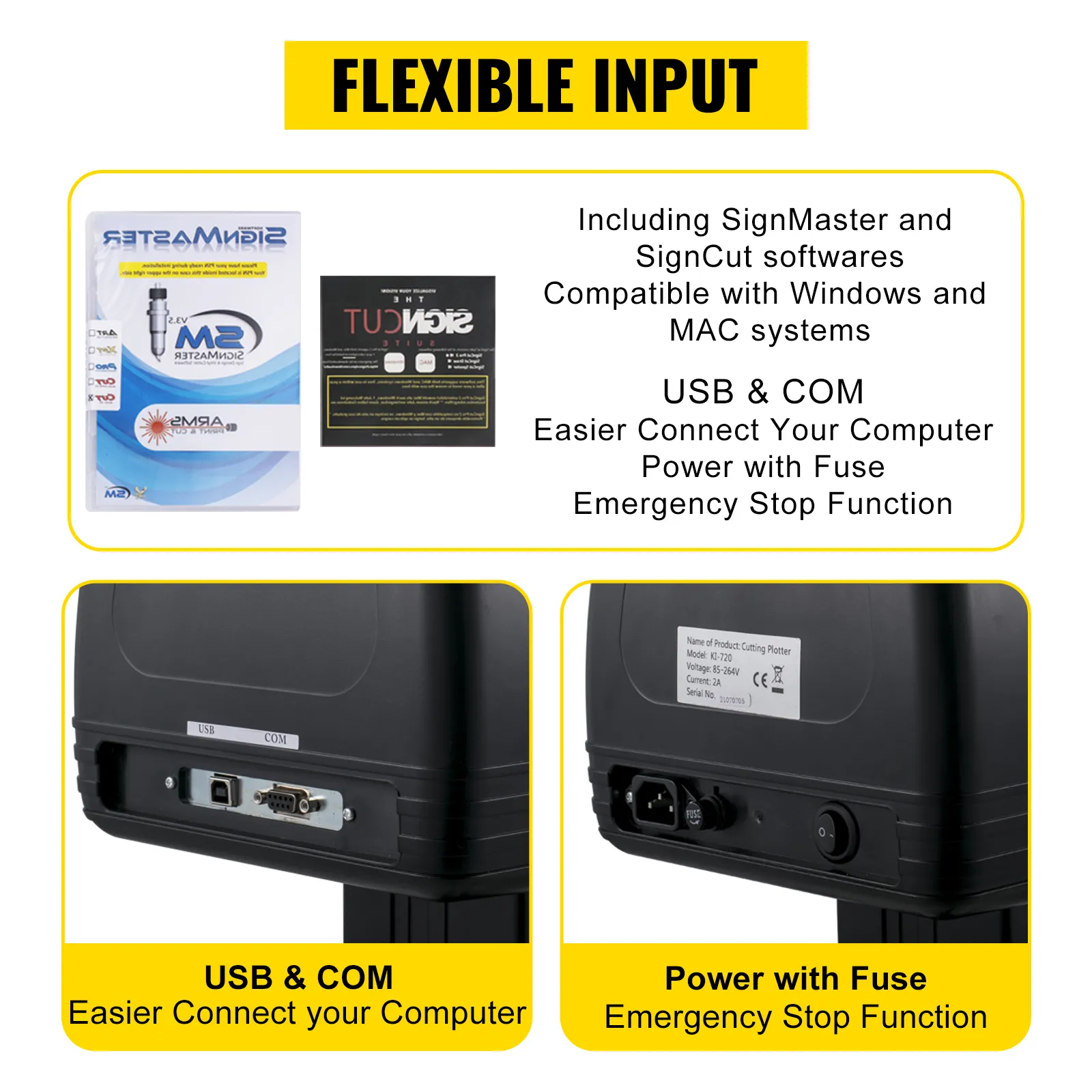 Sluit de plottersnijder-vinylmachine aan via drie beschikbare poorten, COMPIM, USB & U-Disk, dus het heeft een hoge compatibiliteit en flexibele invoer. Compatibel met meerdere computersystemen zoals Windows XP/VISTA/7/8/10 (32&64).