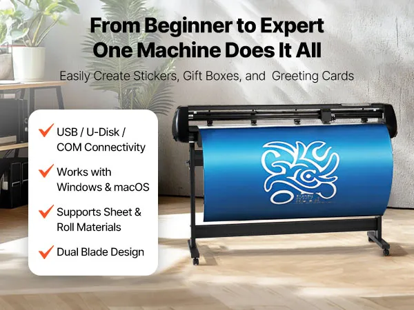 This vinyl cutter machine features a dual-blade design for plotting and cutting/scoring without blade swaps. It is compatible with Windows and Mac. Cuts sheets or rolls up to 1 mm thick with adjustable force. ±0.1 mm precision and contour detection ensure stable, detailed cuts—easy for beginners.
