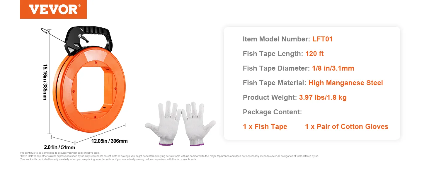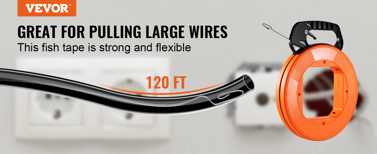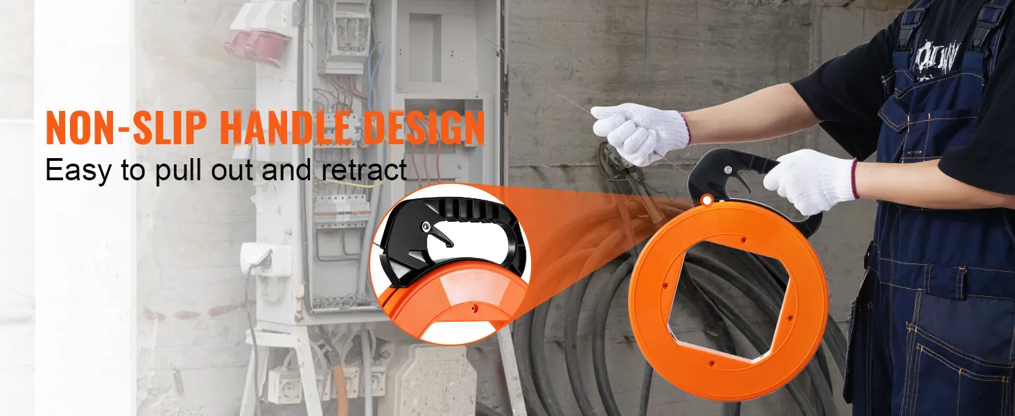VEVOR intrekbare tape, 36 m x 3,1 mm, kabelintrekhulp met geoptimaliseerde behuizing en handgreep, intrekbare spiraal, intrekbare draadtang, draadintrektang voor muren en elektrische kabels, niet-geleidend