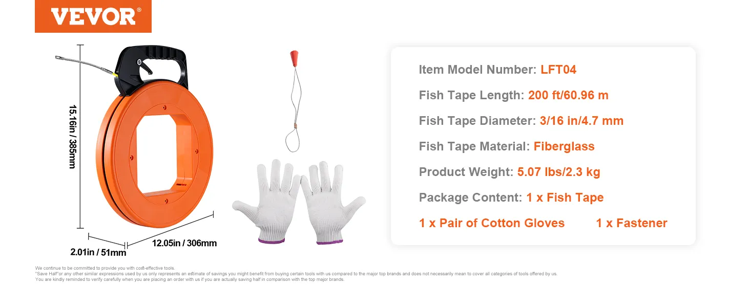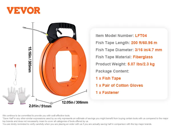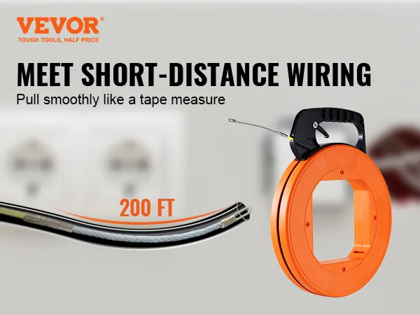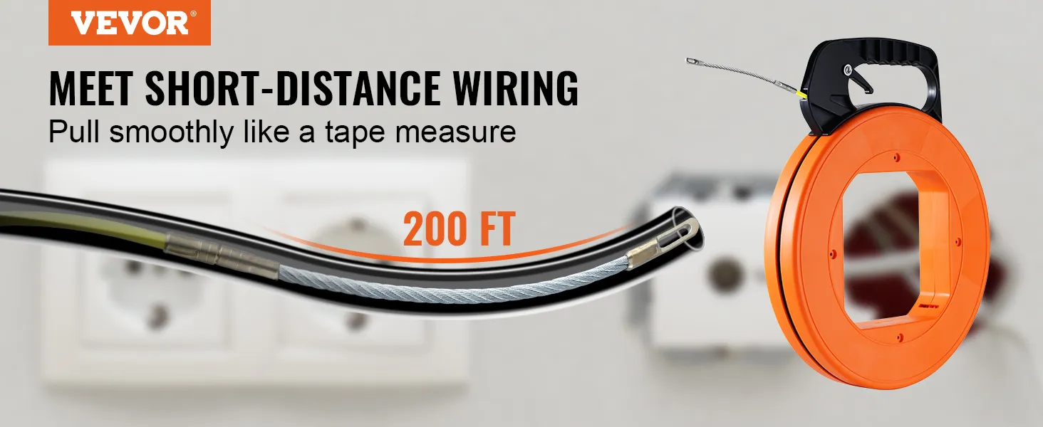 VEVOR Glasvezelkabeltrekker, 60,96 m x 4,7 mm, met geoptimaliseerde behuizing en handgreep, gebruiksvriendelijke kabeltrektang, trekspiraal voor wand- en elektrische draden, niet-geleidend