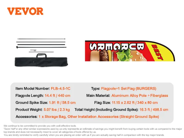 VEVOR 5m veren reclamevlag voor hamburgerrestaurants met mastset, buitenreclamevlaggen voor bedrijven, inclusief 1 bannervlag, 1 mast, 1 grondpaal, swoopervlag voor bedrijven