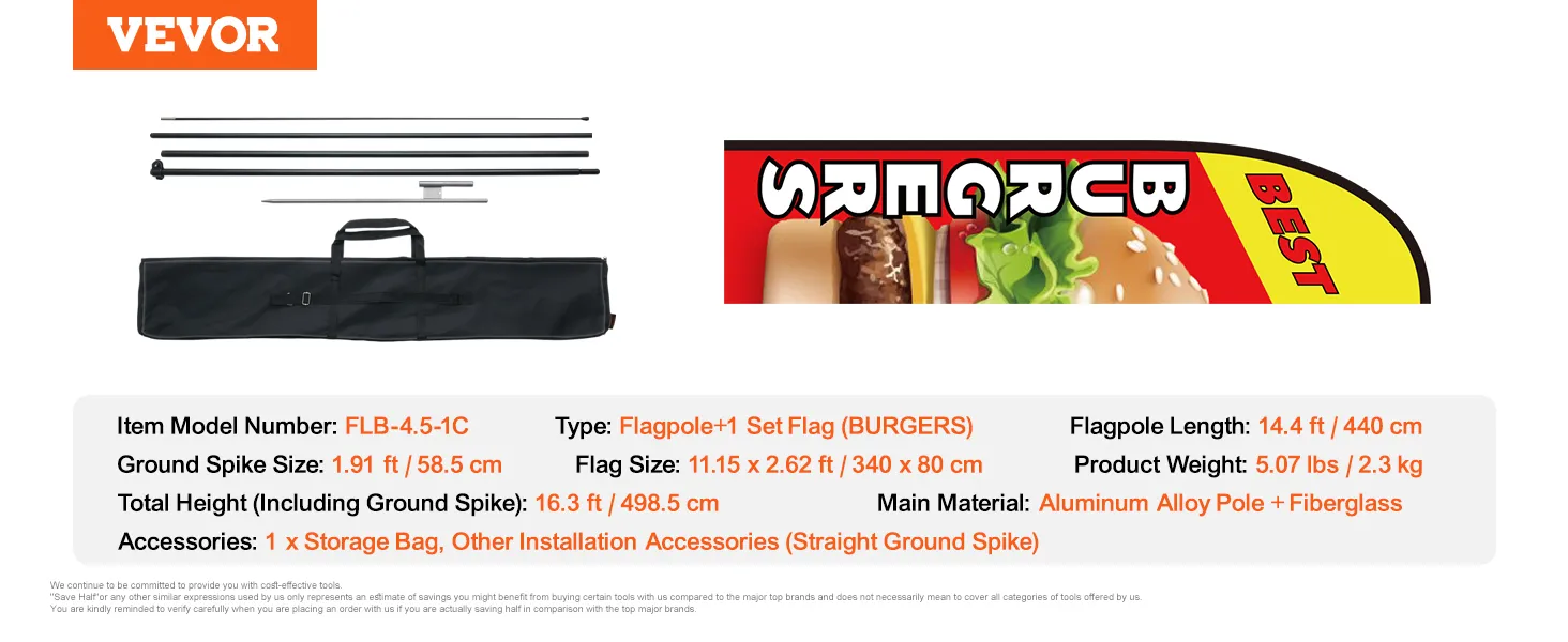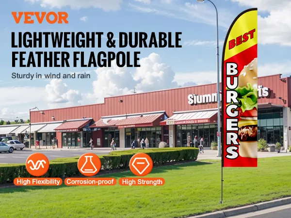 De VEVOR-vlaggenset bevat alles wat u nodig hebt. Het bevat één baniervlag, één paal en één grondpen. Dit betekent dat u hem meteen kunt gebruiken. U hoeft geen extra onderdelen te kopen. Het ontwerp en de materialen van de vlag zijn direct klaar voor gebruik. Dit gemak bespaart u tijd en moeite. Ons alles-in-één-pakket zorgt ervoor dat u een complete en effectieve marketingtool hebt. Begin met het vergroten van de zichtbaarheid van uw merk met deze uitgebreide set.