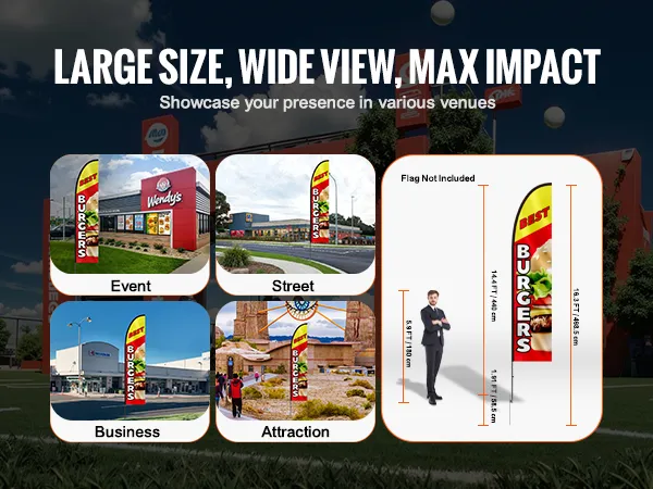 Het ontwerp van de vlag is perfect voor elk burgerrestaurant dat wil opvallen. De grootte en kleur maken het een effectief marketinginstrument. Deze vlag is 16,3 voet hoog, inclusief de grondpen. Het grote formaat van de vlag zorgt ervoor dat hij van een afstand zichtbaar is. De 16,3 voet reclamevlag is ideaal om de aandacht te trekken op drukke straten. Felle kleuren en duidelijke opdruk maken dit nog opvallender.