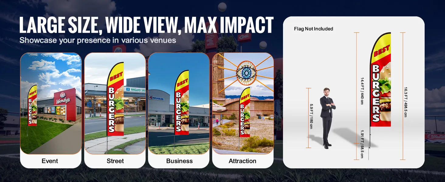 Met een lengte van 440 cm en een totale hoogte van 498,5 cm past onze veren vlaggenmastset perfect op een vlag van 11,15 x 2,62 voet. Het grote formaat verbetert de visuele impact en herkenning van uw merk, waardoor uw advertentie zich onderscheidt van de concurrentie.
