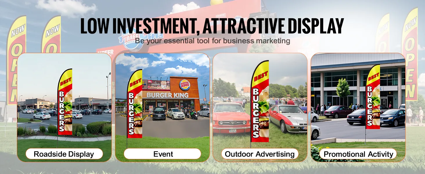 Deze reclamevlag is perfect voor buitengebruik. Het grote formaat en de felle kleuren maken hem ideaal voor drukke straten. Het maakt niet uit of u een hamburgerrestaurant of een ander bedrijf runt, deze vlag trekt de aandacht van passerend verkeer. De duurzame materialen zorgen ervoor dat hij effectief blijft in verschillende weersomstandigheden. Gebruik hem voor buitenevenementen of langdurige winkelreclame. Deze restaurantvlag met veren valt op als een slimme keuze voor elk bedrijf dat de zichtbaarheid wil vergroten.