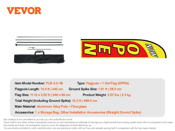 VEVOR Open Flag met mastset, buitenreclamevlag voor bedrijven, promotionele set met verenvlaggen, inclusief 1 baniervlag, 1 mast, 1 grondpaal, open borden, Swooper-vlag voor bedrijven, 5 m