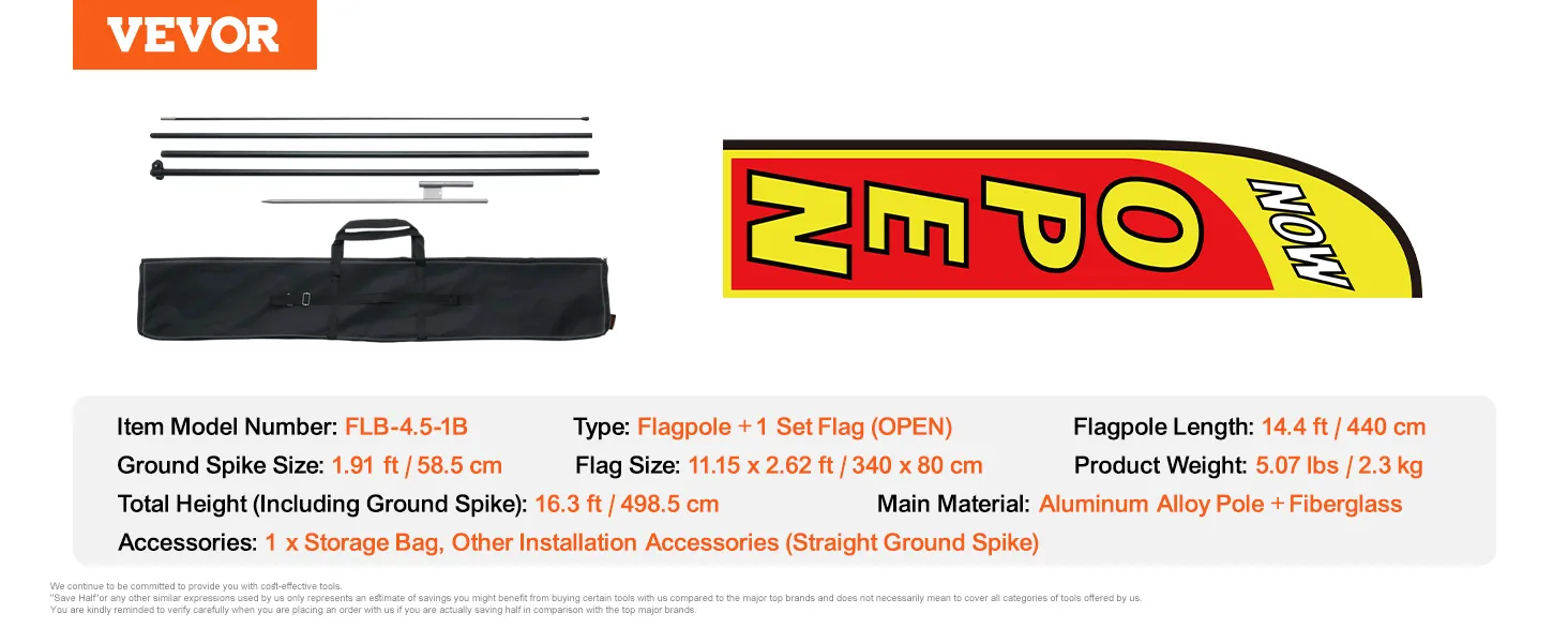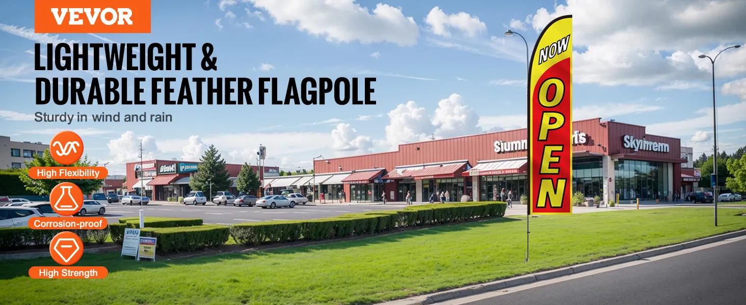 HOOGWAARDIG MATERIAAL: De zakelijke open vlag is gemaakt van hoogwaardige aluminiumlegering en glasvezel met een wanddikte van 1 mm, die zowel licht als stevig is. De glasvezelpunt is corrosiebestendig en buigbestendig en biedt uitstekende wind- en roestbestendigheid voor langdurig gebruik buitenshuis.