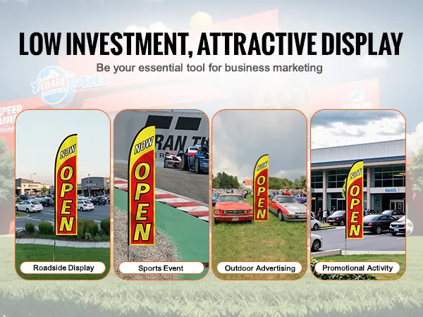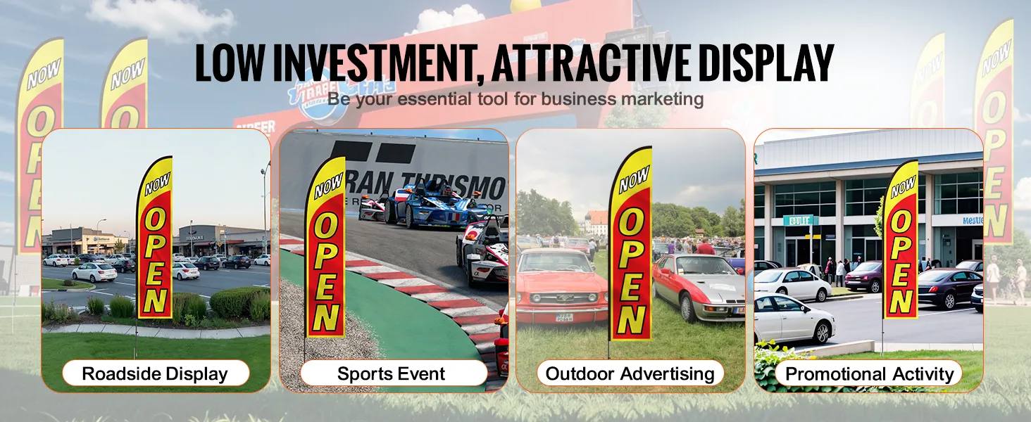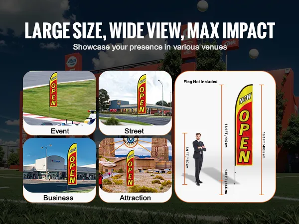 Ze zijn een kosteneffectieve oplossing om de zichtbaarheid van uw merk te vergroten. Deze open vlaggen voor bedrijven zijn compatibel met verschillende veer- of druppelvlagtypes, waardoor ze geschikt zijn voor verschillende commerciële en evenementomgevingen. Of het nu gaat om winkelpuien, drukke straten, tijdelijke displays of permanente displays, ze bieden betrouwbare en betaalbare manieren om uw product te promoten.