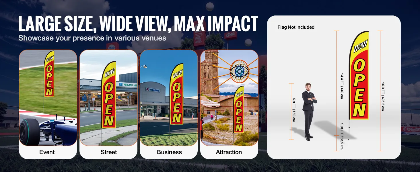 Open vlaggen voor bedrijven zijn verstelbaar, waardoor ze geschikt zijn voor verschillende hoogtes. Ze passen op een 11,15 x 2,62 ft feather flag. Deze grote maat zorgt voor maximale zichtbaarheid en impact op afstand. De felle kleuren en duidelijke print maken het gemakkelijk voor mensen om uw boodschap op te merken. Dit maakt het effectiever als marketingtool.