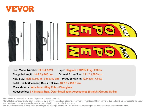 VEVOR Open Flags with Pole Kit, Advertising Flags for Business Outside, Advertising Feather Flag Kit, Includes 2 Banner Flags, 2 Poles, 2 Ground Stakes, Open Sign Swooper Flags for Businesses 16.3 FT
