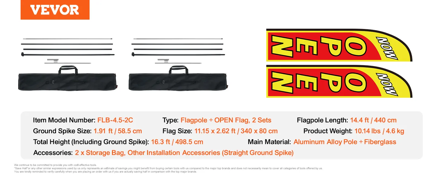 Large Size, High Visual Impact: The total height: 16.3 ft (including ground stake), the flagpole height: 14.4 ft. This swooper flag pole fits an 11.15×2.62ft feather flag. Its large size enhances the flag's visibility and draws attention from afar, ideal for outdoor advertising and events. Includes 2 banner flags, 2 poles, 2 ground stakes.