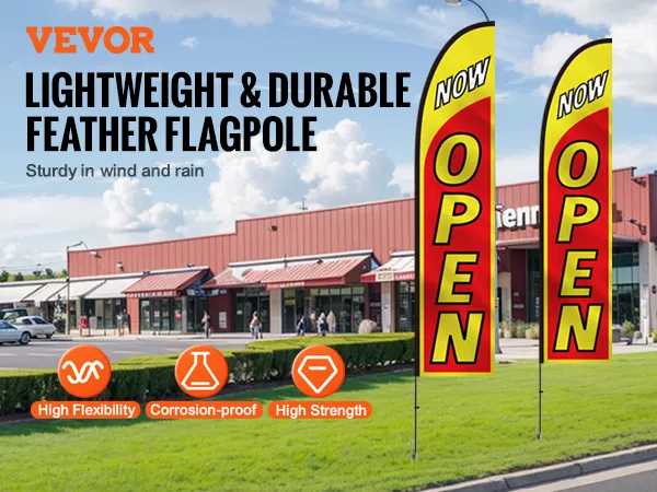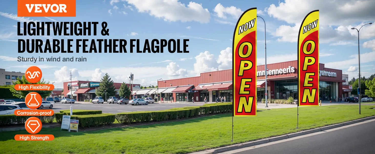 Premium Material: Crafted from high-quality aluminum alloy and fiberglass with a 1mm wall thickness, these open flags for business are both lightweight and strong. The fiberglass top is corrosion-proof and bend-resistant, offering excellent wind and rust resistance for long-term outdoor use.